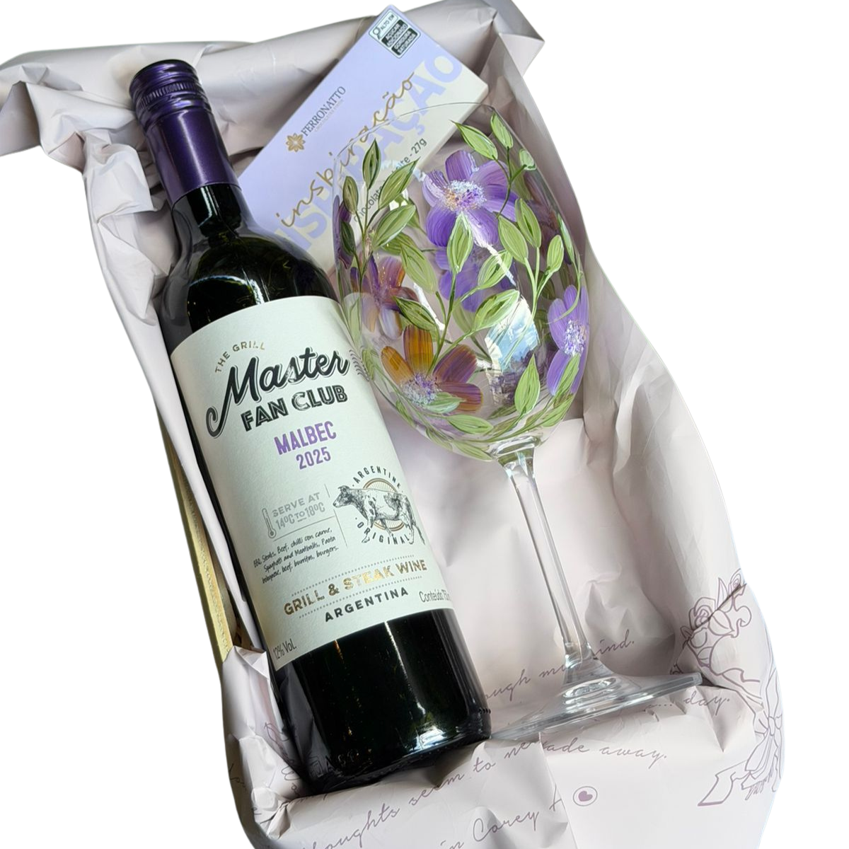 Kit Presente Premium com Vinho Tinto, Taça Pintada à Mão e Chocolate