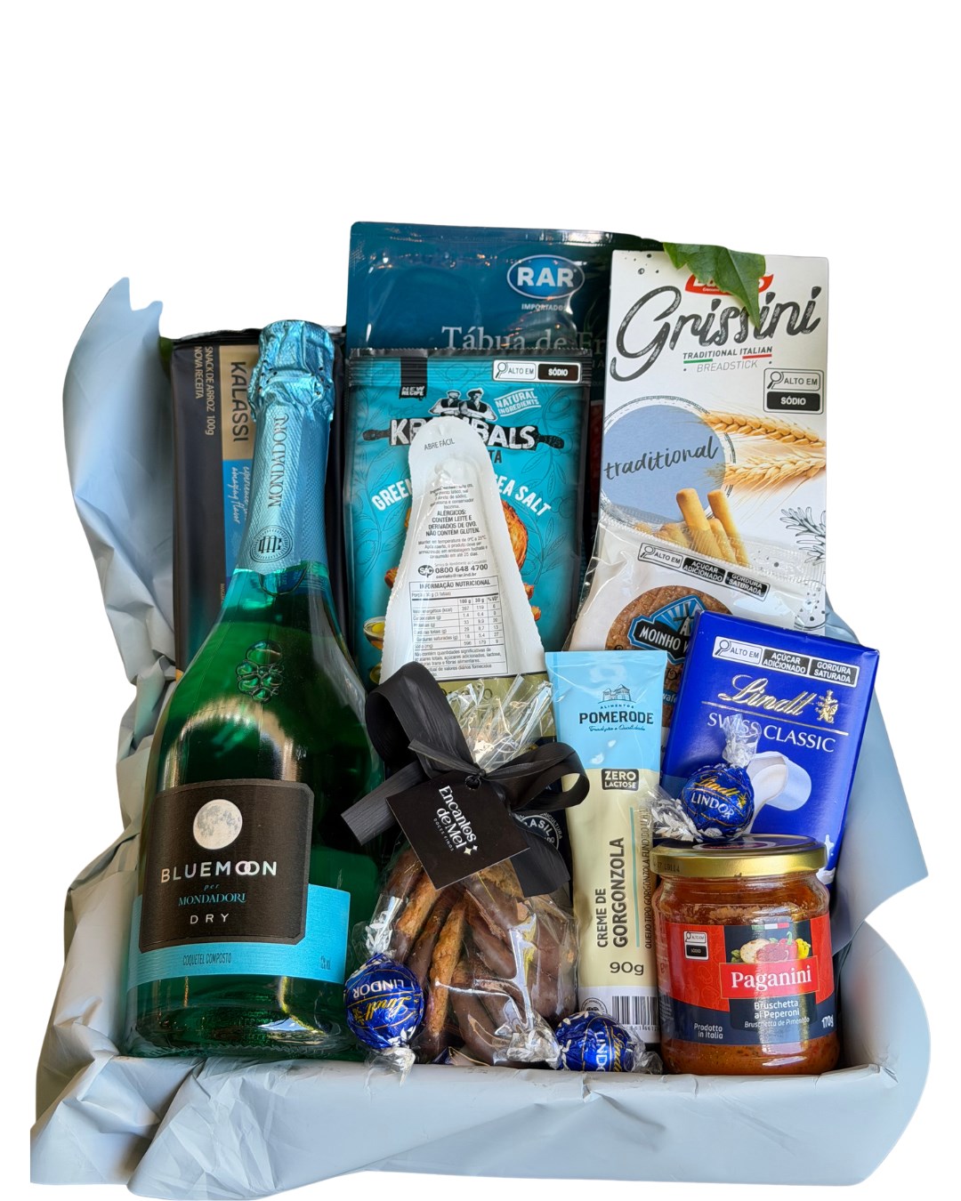 A composição reúne espumante Blue Moon Dry, chocolates Lindt, grissini italiano, bruschetta de peperoni, cookies artesanais, creme de gorgonzola, snacks premium e tábua especial. Uma combinação equilibrada entre doce e salgado para proporcionar uma experiência completa.
