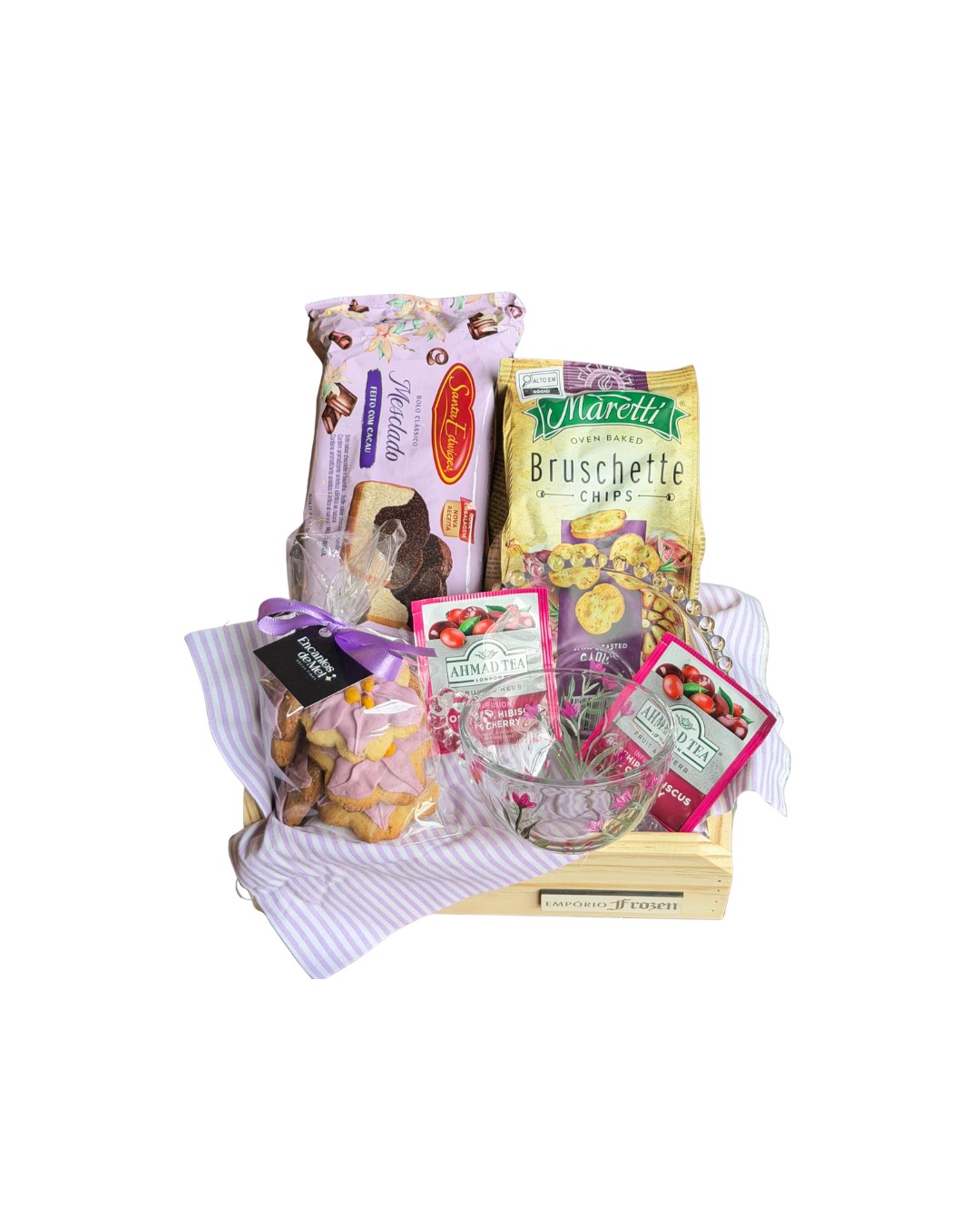 Imagem meramente ilustrativa. Por se tratar de produto artesanal e montagem manual, podem ocorrer pequenas variações na composição, embalagem ou estampa dos itens. Em caso de indisponibilidade, algum produto poderá ser substituído por similar de igual ou maior valor, mantendo a qualidade e proposta da cesta.